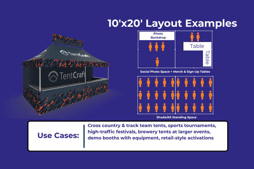 Cross country & track team tents, sports tournaments, high-traffic festivals, brewery tents at larger events, demo booths with equipment, retail-style activations |